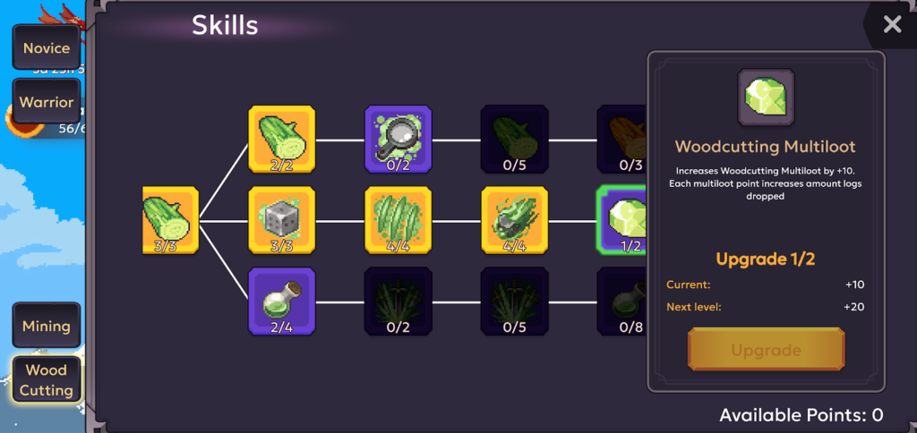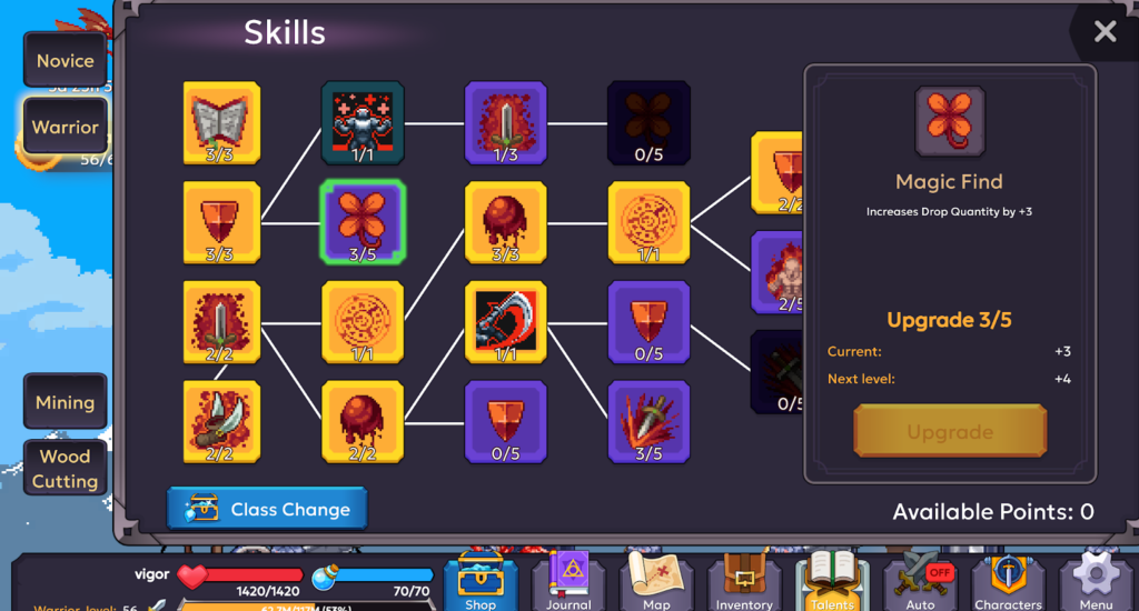 Beyond combat, there are talents for both your class and your professions. The main professions, Mining and Woodcutting, have their own talent trees that offer two paths to give use to all those “useless” stats you may have leveled up so far.