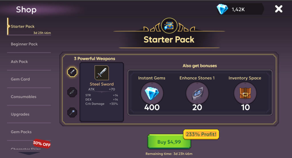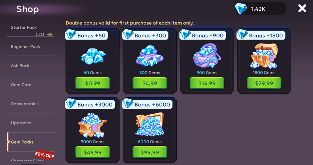 Originally a mobile title, Evitania features a shop as a main mechanic. It offers one-time purchase packs, event packs, and a top-up tab for gem packs reaching up to $100. While there are plenty of cosmetics, paying between $20-$50 will speed up your gameplay 10-20x compared to a F2P player because the deals offer permanent quality-of-life increases.