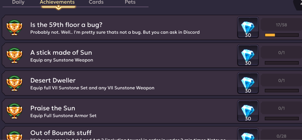 There are also in-game achievements that serve both as a progress guide and as a reward for completing certain feats. These achievements offer clear goals, such as reaching specific floors, equipping Sunstone armor sets, or finding “Out of Bounds” content. By using these as a roadmap, you can plan ahead and figure out what to focus on next in your gameplay.